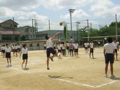 昨日とは一転、炎天下のもと3年生は暑さにも負けず球技大会で熱戦を繰り広げています。コートのかたわらに各学級の学級旗を掲げ盛り上がっています。グラウンドから聞こえる歓声もひときわ大きく感じます。さすが3年生、迫力が違います。一昨日から2年、1年と見てくると、プレーも上達していますが、何より体力がぐーんと伸びていることがわかります。最後まで気迫のこもったプレーを続けてください。
