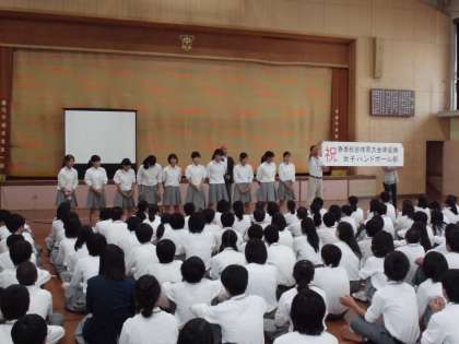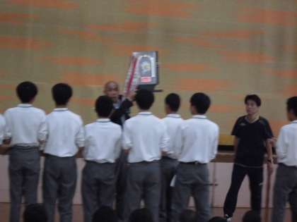 表彰の後、各部のキャプテンが前に出て、それぞれの結果報告を行いないました。次の大会ではさらなる高見をめざしてがんばってください。