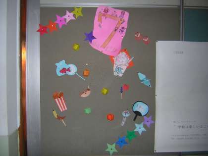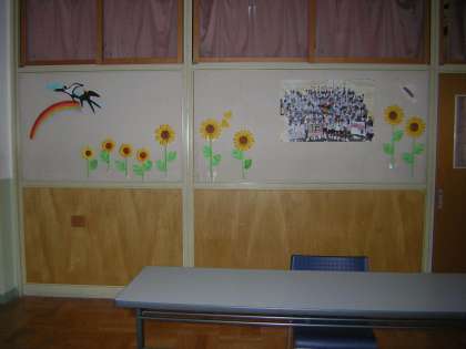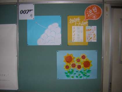 これは2階の多目的室前と3階の生徒会室前の掲示物です。2階のものは3年生の集合写真の周りに折り紙のヒマワリが咲き誇っています。3階のフロアは夏の風物詩が飾られ、入道雲とやはり、ヒマワリの花。学校は夏模様になっています。このようなほのぼのとした掲示物がはがれることもなくみんなの目にとまります。こんな小さなものからも今の学校の状態がうかがえます。