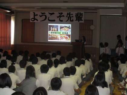 「ようこそ先輩」というタイトルで本校の卒業生2人(現在、山城高校・華頂高校在学)と京都学園高校の先生を講師に招いて進路に関する話を聞きました。二人の卒業生は自分の経験談や受験に対する心構えについて語ってくれました。高校の先生からは、自分の進路を自分で切り拓いていく意義や、大切にしなければならないことなどのメッセージをいただきました。