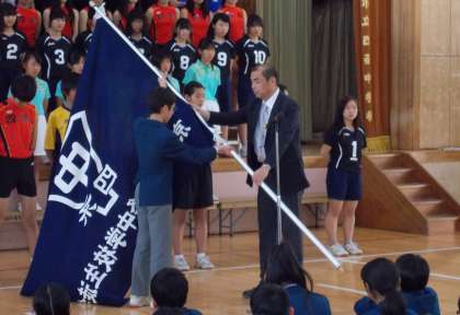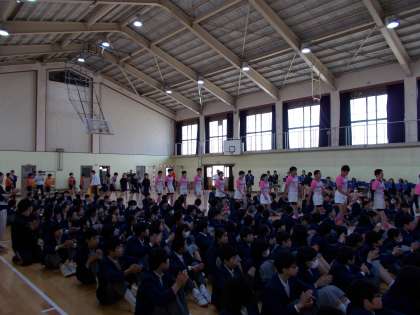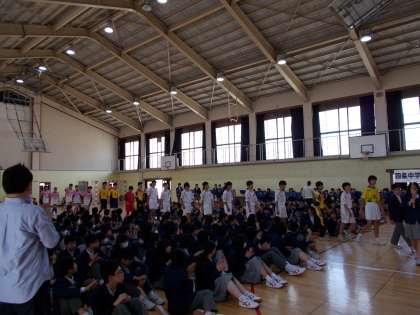 4月28日(金)6限に春季大会激励会が体育館で行われました。吹奏楽部の演奏に合わせて入場した後、各部のキャプテンが大会に向けての抱負などを語ってくれました。それぞれの部から春体に向けての熱い思いと強い意気込みが感じられました。その後、校長先生の激励の言葉、生徒会代表からの激励の言葉、生徒会旗授与、選手宣誓と続きました。全校生徒のみなさんは、しっかりと話を聞き、大きな拍手で応えていました。