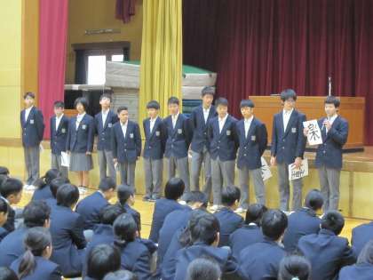 校長先生の話は,“自分で変えられること”と“自分では簡単には変えられないこと”とがあるが,まずは“自分で変えられること”に目を向けるところからスタートしてみよう! というお話でした。生徒会からは,本部一人一人から今年の抱負を漢字一文字であらわし,その理由の紹介がありました。