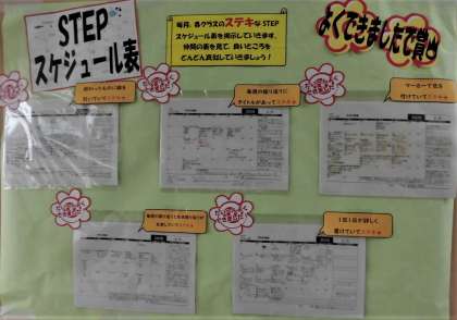 1年生の会の階段には,STEPスケジュール表の優秀作が掲示されています。計画と反省が,とてもしっかりとまとめられています。ぜひ参考にしてください。