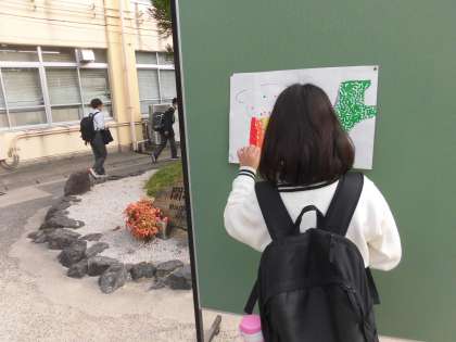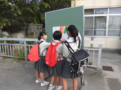 生活委員会による,あいさつ運動実施中です。前回に引き続き,しっかりあいさつを返してシールを受け取り,にじっくまくんを完成させよう。
