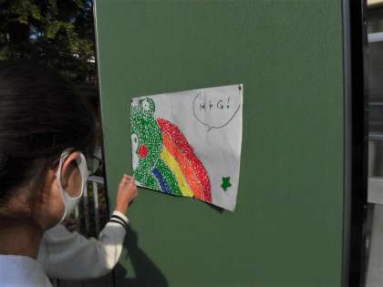 朝はひんやりと肌寒いです。校内の木々も,色づいてきました。生徒会のあいさつ運動も,いよいよ終盤です。あいさつの数だけ張り付けたシールで,大きな絵もそろそろ完成かな。