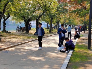 平和公園に到着しました。公園内で昼食を取っています。穏やかな晴天の下とても気持ちよさそうですね・・・