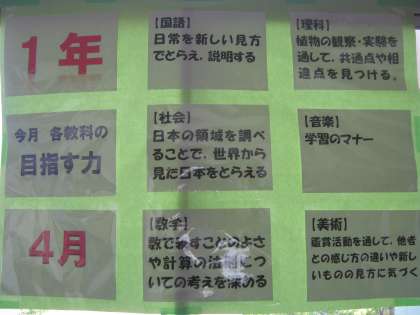 下の写真は,廊下の掲示物です。学年ごとに「今月の各教科の目指す力」が書かれています。本校のカリキュラムマネジメントの取組の一環で,子どもたちにつけたい力を子どもたちにも見えるようにしています。