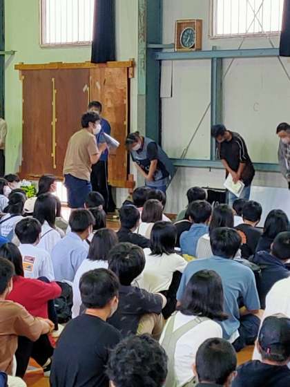写真は,退村式の様子です。雨のため体育館で行いました。