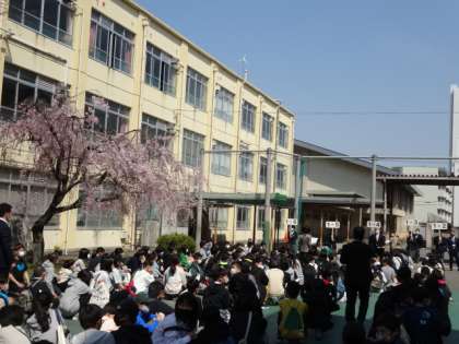 2,3年生のみなさんに手伝ってもらって,無事に入学式の準備が整いました。1時半,新入生が登校し,自分のクラスを確認したあと,体育館で入学式の練習をしています。今日は私服で登校しているのでまだ小学生っぽく見えますが,明日制服を着たらみなさん立派な中学生に見えるんでしょうね。楽しみです。