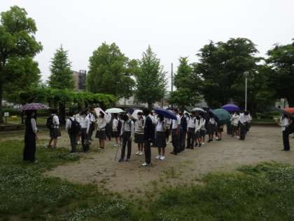今日は2年生校外学習です。小雨の降る中,西京極駅横の公園に3グループに分かれて集合し,阪急電車で神戸に向かいました。神戸につく頃には雨も止んでいるでしょう!楽しい思い出をつくってきてください!