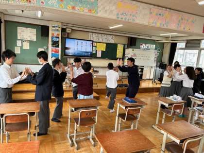 音楽では、手やからだを使ってリズムを取り、”音”を体感していました。歌うだけではない音楽の授業。生徒たちは、”音”をからだで体感すると”楽しく”なり、「音楽」となるようです。