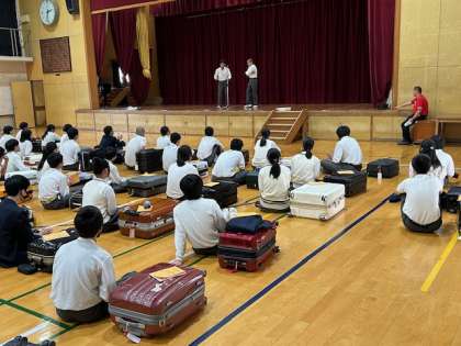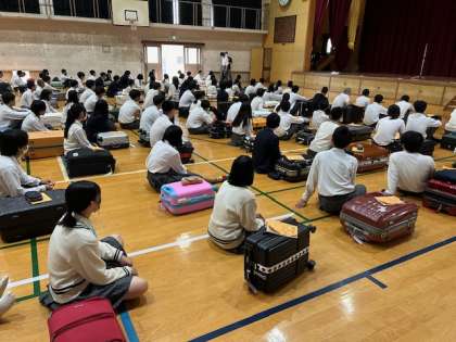 いよいよ、3年生は、明日7日(金)から9日(日)の3日間、沖縄方面に修学旅行に行きます。その学習をいいものにするために、本日6限に体育館で結団式を行いました。司会者の漫才から始まり、実行委員長や各先生方からいろいろなお話を聞きました。1つ1つの作業に「今から修学旅行に行くよ!」と心が整えられるようでした。「本気で学び」「本気で楽しむ」そして、「沖縄のすべてに敬意をはらう」気持ちを大切にして行き、無事に帰ってきます。