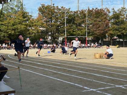 「4.部活対抗リレー」では、それぞれの部活が特徴を出したり競い合うなど、とても見ごたえのある競技でした。柔道部のバトンは、大きな畳。そのバトンを受け取る時に投げ技が披露され、会場からは大きな歓声と拍手が起こっていました。そして、やはり陸上部は速かった!