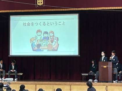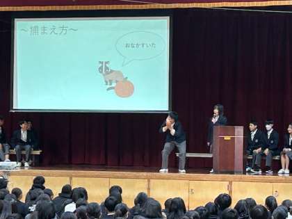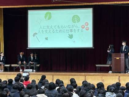 2年生が、チャレンジ体験を通して「学んだこと」や「仕事」とは何か?、「こんな力を付けてほしい」などを、1年生に分かりやすくクイズ等も交えて説明をしてくれました。特に、「こんな力を付けてほしい」では、どの班も「コミュニケーション能力」が必要だと伝えてくれました。