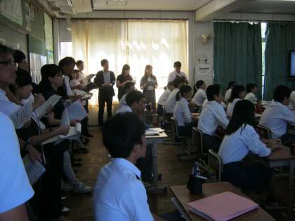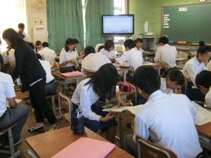この日、右京区の中学校で、研究授業と研修会を合同で行いました。本校は3−1の英語の授業を見てもらい、その後授業に関する意見交換を行いました。とくに英語は、小学校で正式な教科となるように、これからますます重視される教科です。熱の入った研修会となっていました。