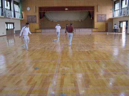 床の修繕工事も今日が「中日」です。昼過ぎに様子を見に行きました。すると、床を削って磨く作業とワックスを塗る作業まで終わっていました。今は、写真のように、競技用のラインを引くための準備作業中でした。各競技用のコートの図面を基に、計算をしながら正確にラインを引く作業は、みんな集中しておられて、気軽に声をかけられない状況でした。