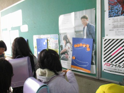 生徒会本部役員の生徒は小学校で、児童会とともにアピール活動。そのひとつ、梅津小学校では、いい挨拶を返してくれた児童に渡す「シール」と貼り付ける「台紙」を用意してくれていました。この台紙にシールを貼っていくと、ある文章が浮かびあがります。さて読めたかな。