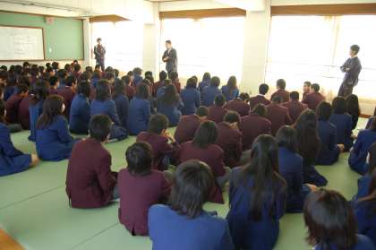 写真は2年生の学年集会の様子です。