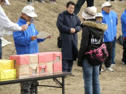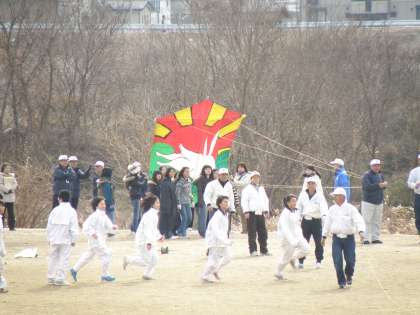 第一部は少年・子どもの部で小さな凧があげられ、二部では各種団体、小中学校、PTAなどの畳二畳ほどの中凧が、そして最後には少年補導、各種団体の畳何十畳もの大きさの大凧があげられました。見事大凧は宙に舞い、素晴らしい光景でした。その後各部門毎に賞が決められ、表彰式が行われました。本校も凧のデザイン部門で賞を頂きました。