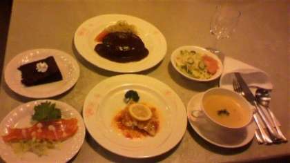 1日目は、フルコースディナー(テーブルマナー講習を兼ねる)です。写真はその一部です。本日ラストの情報です。