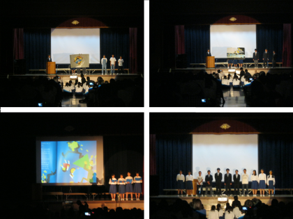 オープニングに続き1年生。『世界で一番貧しい大統領のスピーチ』と言う絵本を題材にした発表でした。これは、世界の環境問題について話し合った2012年のリオデジャネイロ会議で、ウルグアイの当時のムヒカ大統領がスピーチした内容を元としたものです。世界に衝撃を与えたとても有名なスピーチを改めて絵本で見て、生徒の声で聞くと、今の私たちの生活について、考えさせられることがたくさんありました。