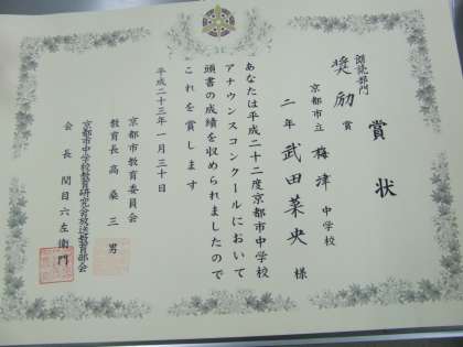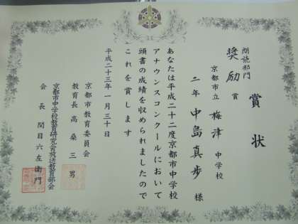 遅くなりましたが、先日ありました京都市アナウンスコンクールで本校が奨励賞を頂きました。