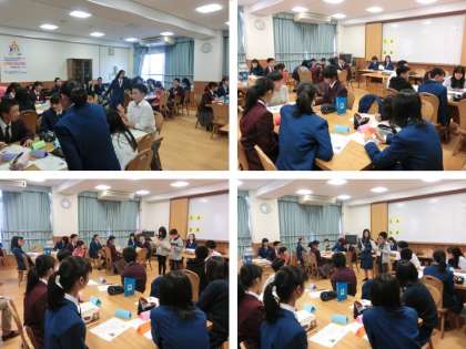 5日の放課後,本校いきいき交流ルームにて,梅津中・梅津小・梅津北小の生徒会・児童会の代表者による交流会が開かれました。サミットという名の通り,生徒・児童の代表者が集まり,今後の小中学校や地域のありかたを話し合うもので,今年,初めて企画されました。前半は事前に小学校にアンケートを取り,部活や校則など出された質問に対して中学生が答える形で進みました。後半は4つのグループに分かれて,「いいことばの日の活動をもっと良いものにしていくためには」というテーマで話し合いました。活発に意見交換が行われ,今後に役立てられる意見がたくさん出ました。グループの代表で小学生がしっかり話ができているのを見て,中学生も感動の声を上げていました。今後がとても楽しみです。