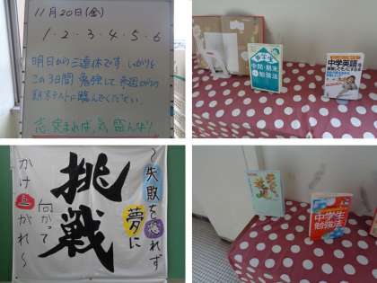朝から久しぶりの本格的な雨でした。昼前には一旦上がり、昼休みにはグランドで遊べる状態でした。来週からの期末テストに向けて、校舎内を歩くと様々な掲示物や展示物を目にします。試験に向けての気持ちをしっかりさせたり、勉強方法を支援したり、やる気になるためのものがたくさんありました。明日からの3連休、しっかり計画を立てて、学習進めてください。感染症の流行の第3波が広がってきています。油断せずにしっかり対策よろしくお願いします。本日配布のプリントです。