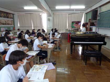 新館での授業をのぞいてみました。1年生の技術の時間。糸のこぎりの使い方の説明の様子です。また,音楽室では,琴という楽器の説明が行われていました。普段ならこの時期,合唱コンクールに向けて,ほとんどその練習に時間が使われているのですが・・・