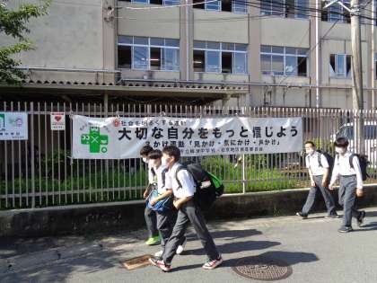 校門横に「社会を明るくする運動」の横断幕が掲示され、「見かけ、気にかけ、声かけ」を呼びかけていますが、教育委員会から誘拐メールについての連絡がはいりました。