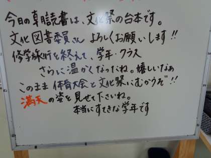 今日から3年生も6時間の通常授業に戻りました。学校祭に向けての取組も本格化して行きます。進路開拓のこともしながら、ここが3年生としての力の見せ所です。時間を有効に使うこと。ここでの経験が間違いなく、将来に生きてきます。頑張ってください。