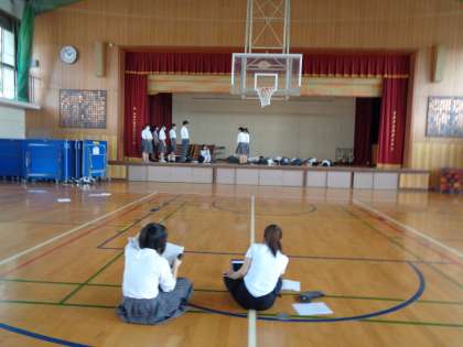 6限目は各学年、学校祭に向けての取組が行われていました。3年は舞台発表・学年劇の立ち稽古が体育館で行われていました。平和学習の一環の劇ということで・・倒れている人が居るシーンでした。心をこめて演じて下さい。