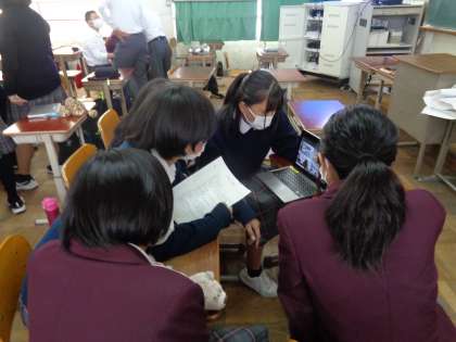 11:00〜12:00の1時間。中学2年生と両小学校の5年生がオンラインでつながり、交流学習を行いました。TEAMSというソフトを使い、中学2年生がリードしながら、「仕事・職業」をテーマに意見を交わしました。中学生が作成した短編ビデオを共に鑑賞しながら意見を交流しました。お互いの教室にいながら繋がれるというのは、驚きですが、子どもたちは難なく機器を操作していました。この2学年は中学では共に過ごすことはないので、またこのような機会があるといいですね。