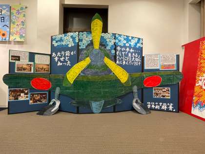 展示された作品は、1年生の嵯峨・嵐山の切り絵と3年生の学年劇「群青」のセットとして使われたものをアレンジした物です。いずれも迫力がありすばらしい作品です。特に3年生の作品は、平和の尊さを訴える作品となっています。
