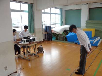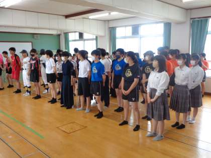 本日1限目、夏季大会に挑む運動部とコンクールやコンテストに参加する文化部の3年生を激励する会が行われました。あいにくの雨で、多目的室からのZOOMによる激励会になりました。