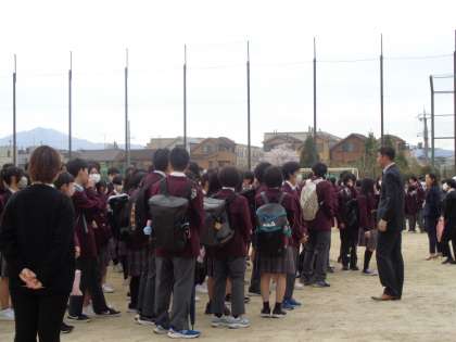 朝早くから、登校してきた生徒の関心は、新しい学級や友だち、担任の先生のことでいっぱいです。まずは新しい学級で整列、そして体育館へ移動しました。