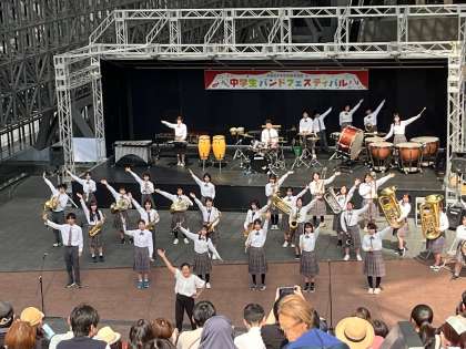 5月26日(日)昼過ぎ、京都駅ビル 室町小路広場 大階段前特設ステージにて、「2024 春の中学生バンドフェスティバル」が開催されました。これは、京都府中学校吹奏楽連盟に加盟の学校によるコンサートで、本校吹奏楽部も参加しました。