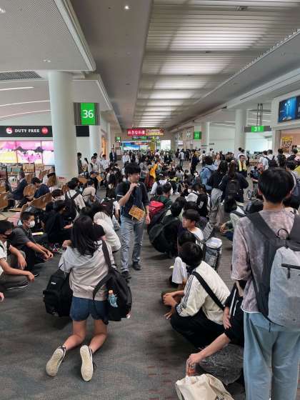荷物を受け取る前に待機しています。飛行機に酔った生徒もいましたが、みんな元気です!