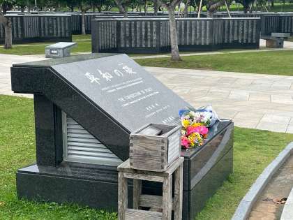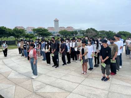 慰霊碑の前で平和セレモニーを行いました。黙祷を捧げました。