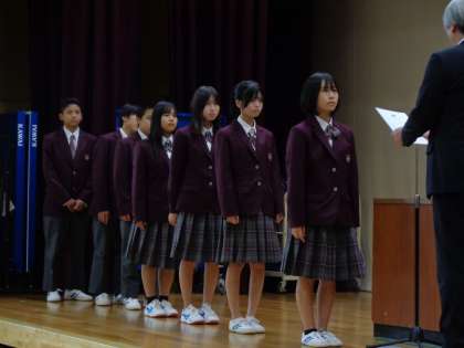 そして、学級役員代表の認証、新生徒会長の挨拶、そして新生徒会本部から初めての梅津の志の全校唱和と続きました。