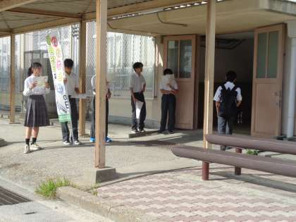 本日も生徒会本部と各クラスの評議員の皆さんが、校門付近、校舎東側入口、東側畑、西門付近に分かれて挨拶運動を行いました。