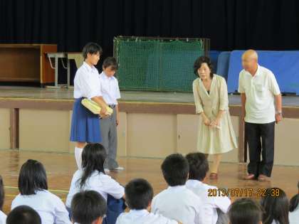 7月18日(木)、明日に第1期終業式を控え、恒例となりました、保護司会の皆さんから1年生へファイルが贈呈されました。今年度はわざわざ直接代表の方に本校にお越し頂き、直接一年生へクリアファイルが渡されました。ありがとうございました。