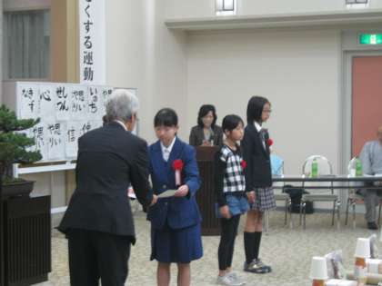 社明(しゃめい)運動と呼んでいますが、その一環として行われた作文・書写コンテストに、本校生徒も多く応募し、そのうち作文部門に応募した3名が賞に選ばれました。そのうち2名が、この日盛大に行われた表彰式出席しました。どれも本校生徒全員にも読んでもらいたい内容の、いい作文でした。おめでとう。