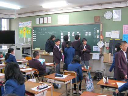 写真左は3年生のあるクラスで、担任の先生の話の後、ビデオ教材の視聴が始まったところです。写真中は1年生で、4人グループで「YES・NO」の議論を交わしています。写真右も1年生ですが、ここはクラス全体で名前カードを使って、意見発表をしています。