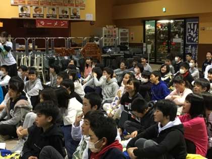修学旅行のクライマックス 学年レクレーションの様子です。クラスごとの発表、有志の発表、クラス対抗クイズ大会、などすごく盛り上がりました。先生の寸劇もすごかったです。最後に今回のテーマソング「小さな恋の歌」を全員で合唱して幕を閉じました。