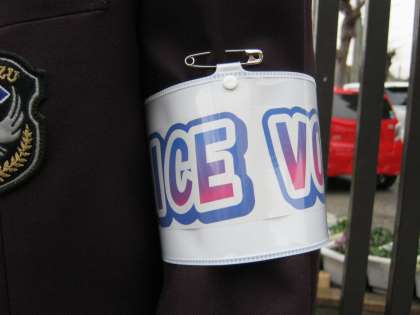 アイデアいっぱいで前向きな生徒会本部役員。月曜日から「NICE VOICE週間」に取り組んでいます。