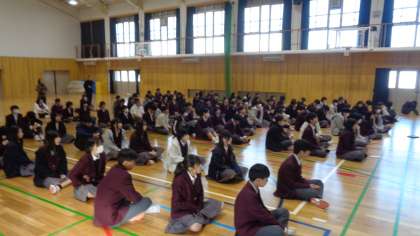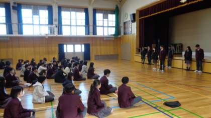 各クラスの振り返りと生徒会本部のみんなから3学期にチャレンジしたいことと協力してもらいたいことの発表がありました。その後、学年の先生方から2学期の振り返りと3学期に頑張ってもらいたいことの話がありました。
