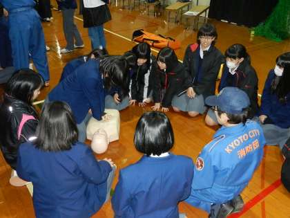 グループに分かれて、訓練用の人形を使って心臓マッサージの練習もしました。