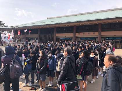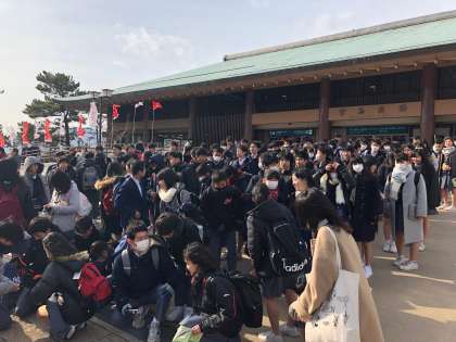 宮島到着。フェリーを下りて集合。このあとガイドさんに案内してもらって厳島神社参拝、そしてしばし自由行動の予定です。