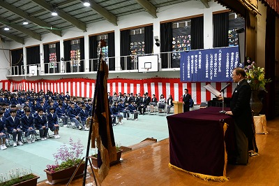 「新入生、起立」「礼」。学校長式辞、そして祝辞。みんな少し緊張した表情で話をしっかりと聞いていました。